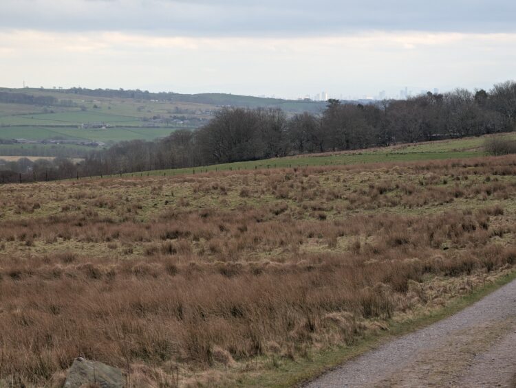 On leaving the tower, I turned right up the hill to cross the railway again and then turned right to walk past Clough House Farm and return to my starting point. I have done this walk many times and I always find something new and this day was no exception. As I walked on, I turned and I could clearly see central Manchester in the distance.